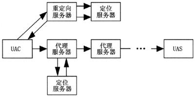 如圖2所示,SIP網(wǎng)絡(luò)采用IP網(wǎng)絡(luò)常用的客戶機/服務(wù)器(C/S)結(jié)構(gòu),定義了若干種不同的服務(wù)器和用戶代理,通過與服務(wù)器之間的請求和響應(yīng)完成呼叫和傳送層的控制。