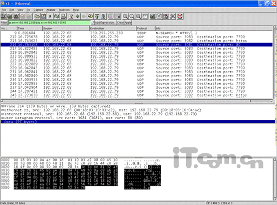 我們?cè)诰钟蚓W(wǎng)中放入兩臺(tái)callfreee設(shè)備,同時(shí)接入一臺(tái)PC運(yùn)行ethereal軟件進(jìn)行抓包來分析協(xié)議。