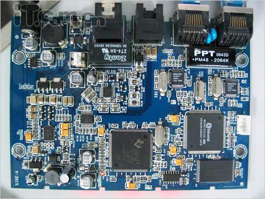 設(shè)備由幾個(gè)螺絲固定,上下兩個(gè)外殼由8個(gè)卡口卡住,卡后連接非常緊密,在沒有特殊器件的情況下不用暴力無法打開。拆開后,就可以看到下圖的PCB板子,上面密密麻麻的排滿的器件,大體上和通用VoIP適配器方案差不多,但是有些地方不同。