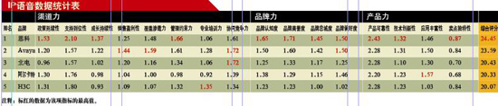 從綜合評分情況來看,思科、Avaya以明顯的優(yōu)勢位列IP語音產(chǎn)品的第一集團,他們的優(yōu)勢非常明顯,幾乎在所有指標上都位居前列,而包括北電、阿爾卡特朗訊和H3C在內(nèi)的品牌位列第二集團。