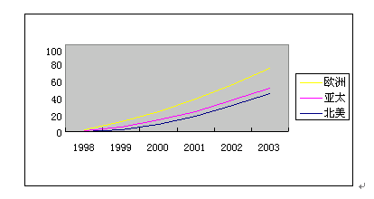 圖4顯示了UM產(chǎn)品和服務從1998到2003年的收入增長預測。UM產(chǎn)品和服務市場在2003年的總體收入預計為100億美元左右。圖5顯示統(tǒng)一消息郵箱的三個UM市場(北美、歐洲和亞太地區(qū))增長預測。
