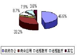 視頻會議系統(tǒng)在我國開始發(fā)展的初期,政府部門的應(yīng)用就占據(jù)了重要位置,覆蓋中央到直轄市和各省會城市的國家公眾視頻會議骨干網(wǎng)已經(jīng)完工。自1994年9月投入使用以來,國務(wù)院等機關(guān)先后利用該網(wǎng)召開了三百多次全國范圍的可視通訊會議。整個系統(tǒng)運行情況良好,得到了國家領(lǐng)導(dǎo)人和各部委領(lǐng)導(dǎo)的高度贊揚。近年來隨著電子政務(wù)工程的逐步推進,政府部門更加關(guān)注視頻會議系統(tǒng)建設(shè)。在經(jīng)濟發(fā)達(dá)地區(qū)(例如浙江、山東、廣東),視頻會議網(wǎng)已覆蓋到地市級城市,有的甚至覆蓋到縣一級。除各級政府之外,其它諸如檢察院、法院、公安和和水利等職能部門也是視頻會議系統(tǒng)的重要用戶。如圖1所示,政府辦公已占全部市場份額的46.6%。
