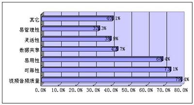 對于視頻會議系統(tǒng)需求特征,我們調(diào)查發(fā)現(xiàn),視頻音頻質(zhì)量、可靠性、易用性排在前三位,數(shù)據(jù)共享、靈活性、易管理性也得到應(yīng)有的關(guān)注和重視,如圖4所示。