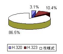 如圖5所示,目前僅僅存在少量單一H.320產(chǎn)品,雙模式產(chǎn)品在市場中占據(jù)著主導(dǎo)地位,單一的H.323模式主要由桌面會議系統(tǒng)占據(jù),市場份額穩(wěn)步增長。