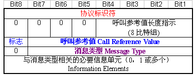 其中的協(xié)議標識符指示消息的參考協(xié)議類型,比如I.451消息的協(xié)議標識符為"00001000";呼叫參考值用于指示消息所控制的B信道上哪一呼叫,該值由發(fā)起呼叫的一側(cè)進行分配,且和某一特定呼叫相關的所有消息都附帶了這個值。
