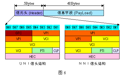ATM信元實(shí)際上就是分組,為區(qū)分X.25分組(Packet)改稱為信元(Cell)。ATM信元具有固定的長度,總長為53字節(jié)。其中前5個字節(jié)為信頭(Header),包含各種控制信息,包括信元目的(邏輯)地址、糾錯碼、業(yè)務(wù)控制和維護(hù)信息等;后面48字節(jié)為信息字段(Payload),又稱凈荷,其中包含了業(yè)務(wù)的數(shù)據(jù),它們將被透明地傳輸。信元結(jié)構(gòu)如下圖6所示。在UNI接口和NNI接口上ATM的信元頭結(jié)構(gòu)是不同的。