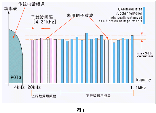 DSL技術(shù)是在人們對高速互聯(lián)網(wǎng)訪問需求推動(dòng)下的產(chǎn)物。DSL利用頻率復(fù)用和OFDM調(diào)制技術(shù),在不影響傳統(tǒng)電話業(yè)務(wù)的前提下可以為用戶提供最高達(dá)8Mbps的數(shù)據(jù)傳輸速率。這個(gè)速率是基于POTS的Modem速率(以目前的最高速率56kbps為參考)的140倍;DSL技術(shù)所帶來的巨大帶寬為家庭和小型公司提供了一個(gè)寬帶數(shù)字業(yè)務(wù)的新平臺(tái)。這個(gè)DSL平臺(tái)可以支持多種寬帶業(yè)務(wù):包括高速Internet接入、虛擬專網(wǎng)及VOD等流媒體業(yè)務(wù)。其基本原理如下圖1所示: