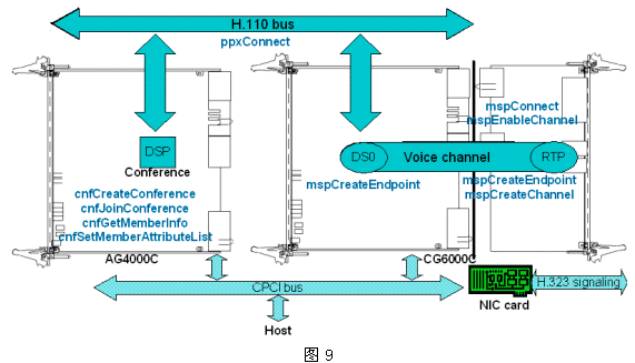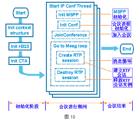 整個(gè)IP會(huì)議大概過程可以用圖10來說明,各子流程均由MGCP/H.323的相關(guān)API函數(shù)完成。