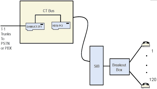 Bus,一個HDSI/1200座席卡可以連接到一個Dialogic® Dialogic® D/480JCT-2T1板卡和一個T-1板卡,建立一個120-station-×-48-trunk交換環(huán)境。應(yīng)用可以使用CT