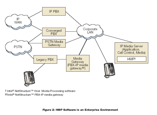 圖2表示使用HMP軟件的IP媒體服務(wù)器,部署在企業(yè)環(huán)境的例子,包括IVR,自動(dòng)應(yīng)答,語(yǔ)音郵箱,統(tǒng)一消息,語(yǔ)音識(shí)別和會(huì)議服務(wù)。
