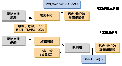 模塊化的下一代網(wǎng)絡將語音和數(shù)據(jù)合并在單個包基礎結(jié)構(gòu)中。這使目前的兩種主要架構(gòu)可用于部署媒體服務;基于直通電路的網(wǎng)絡接口和基于包的IP網(wǎng)絡接口。下面的圖說明了這兩種架構(gòu)。Dialogic HMP軟件可在這兩種架構(gòu)中提供媒體處理。