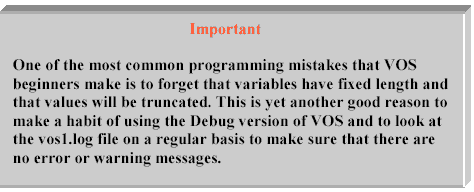 變量長度有限制,如果字符串的長度大于最大長度,則按最大長度取值。如果在調試模式下運行VOS,當一個字符串被截短后會彈出一個警告信息。(如果要避免這些告警,賦值時使用substr函數(shù))