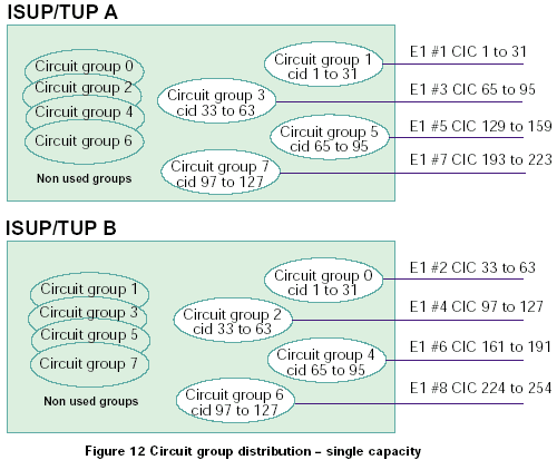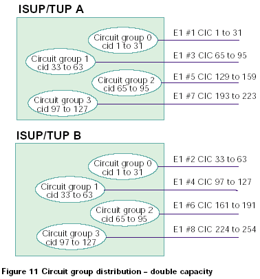 兩個(gè)系統(tǒng)中的電路組既可以從0開(kāi)始編號(hào),也可以?xún)蓚(gè)系統(tǒng)間隔標(biāo)號(hào)。如果使用第一種方法,整個(gè)系統(tǒng)的容量就是單ISUP/TUP協(xié)議層系統(tǒng)的容量的2倍,如果使用第二種方法,系統(tǒng)總?cè)萘颗c單ISUP/TUP協(xié)議層系統(tǒng)的容量相同。對(duì)于這兩種情況,每半部分控制對(duì)立的CIC范圍,如圖11和12所示: