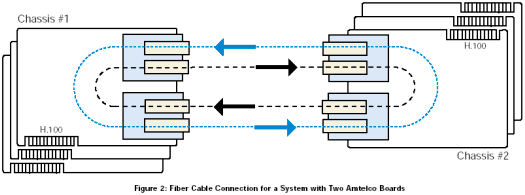 該配置由兩個(gè)服務(wù)器組成,其中一個(gè)配置成主機(jī),另外一個(gè)配置成客戶機(jī)。主機(jī)通過光纖環(huán)路為整個(gè)系統(tǒng)提供時(shí)鐘,客戶機(jī)則通過光纖環(huán)路得到時(shí)鐘。對于主機(jī)服務(wù)器,Amtelco卡需要在Dialogic®